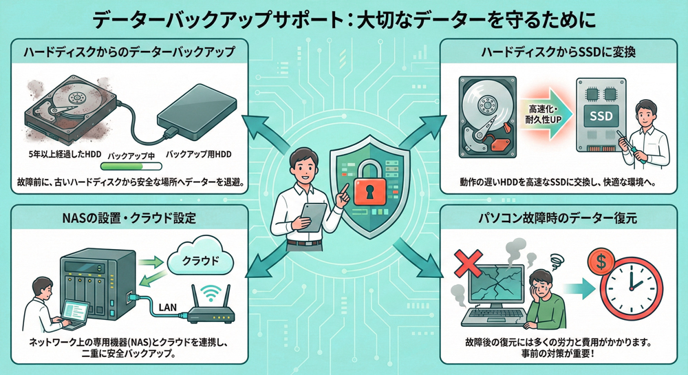 パソコンが故障したときデーターの復元には多くの労⼒と費⽤がかかります。 ⽇ごろからデーターのバックアップをお勧めいたします。