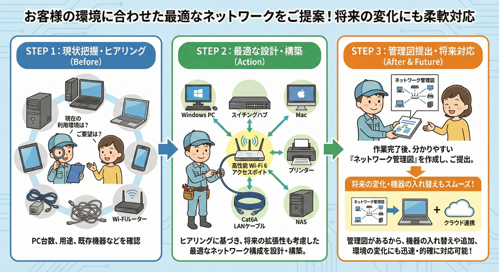 機器の選定から設置まで丁寧に対応 Windowsyy‧Mac混在ネットワークにも対応